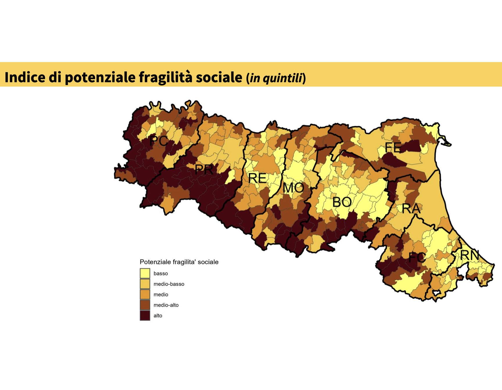 - Fragilità sociale: livelli alti/medio-alti nelle aree montane (anziani soli, famiglie monogenitoriali, scolarizzazione)