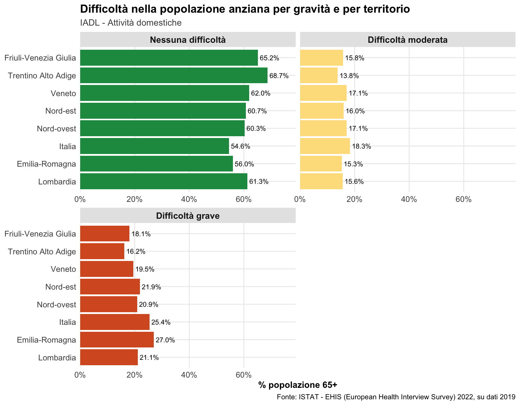 Le IADL (Instrumental Activities of Daily Living - fare la spesa, preparare i pasti, gestire farmaci, pulizie domestiche) mostrano percentuali di difficoltà ancora più elevate rispetto alle ADL. L’Emilia-Romagna conferma una posizione critica anche in questo ambito, se si guarda soprattutto il livello grave di difficoltà, suggerendo un ampio bisogno di supporto per attività domestiche complesse.
