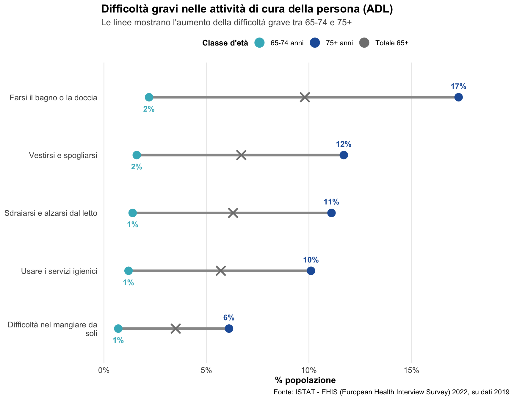 Aumento esponenziale dopo i 75 anni: Le difficoltà gravi nelle attività di cura personale mostrano un incremento drammatico tra 65-74 e 75+. Alcune attività mostrano gap superiori ai 10-15 punti percentuali, evidenziando come l’assistenza intensiva diventi critica proprio dopo i 75 anni. Questo dato è essenziale per dimensionare i servizi di assistenza domiciliare e residenziale.