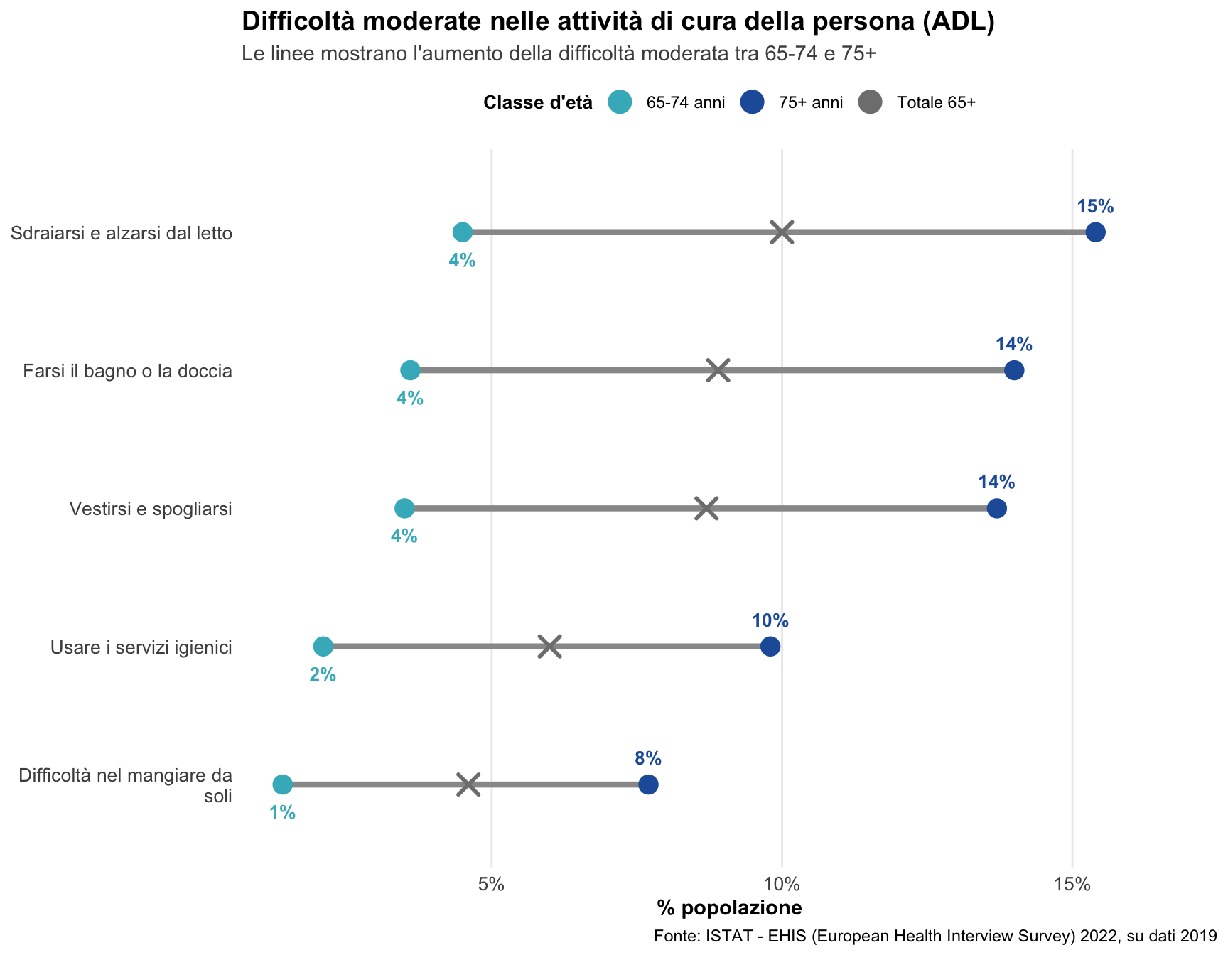 I grafici a bilanciere enfatizzano la differenza tra le due fasce d’età, mostrando visivamente l’entità del “salto” tra 65-74 e 75+ per livello di difficolà incontrato.