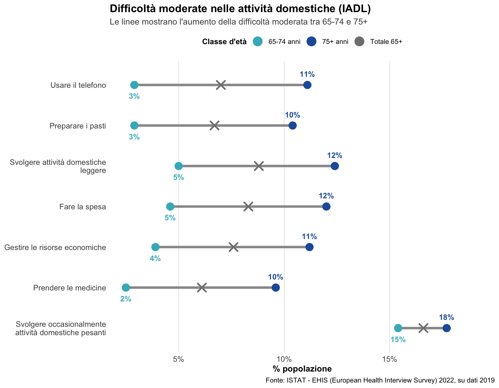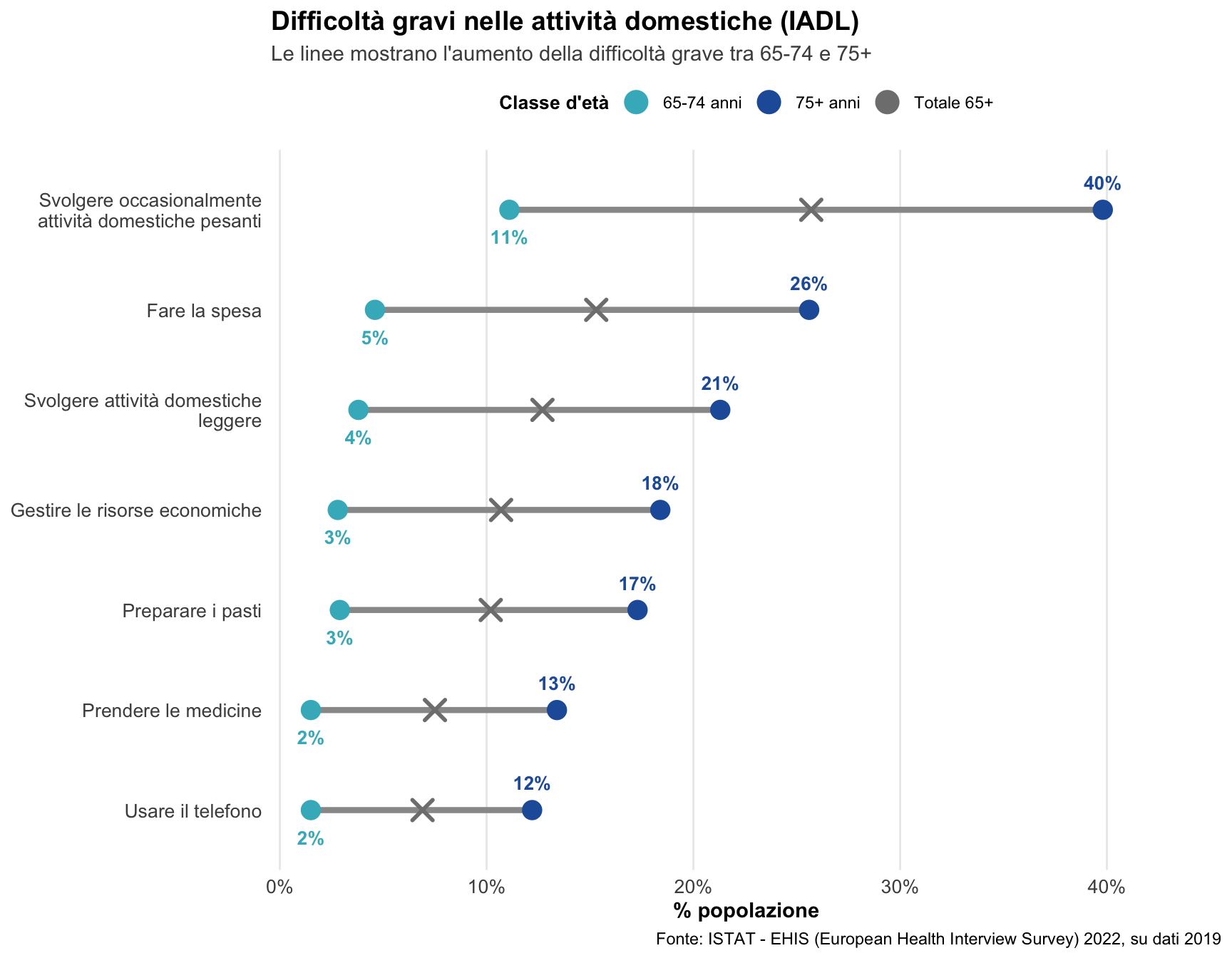 Le attività domestiche come indicatore di autonomia complessiva: Le IADL gravi mostrano un pattern simile alle ADL ma con percentuali generalmente più elevate già nella fascia 65-74. Alcune attività strumentali (gestione farmaci, preparazione pasti complessi, gestione finanze) richiedono integrità cognitiva oltre che fisica, rappresentando indicatori precoci di fragilità multipla.